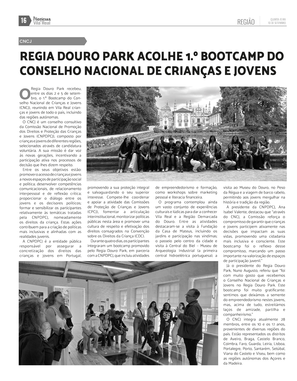 1º BootCamp do CNCJ, uma parceria com o Parque de Ciência e Tecnologia Regia Douro Park, que se realizou em Vila Real, e que contemplou atividades de empreendedorismo e workshops sobre Marketing Pessoal e Literacia Financeira e incluiu diversas experiências culturais e lúdicas para dar a conhecer Vila Real e a Região Demarcada do Douro (2 a 5 de setembro). Clique nas duas últimas imagens para ver dois pequenos resumos de como os jovens do CNCJ passaram este dias.
